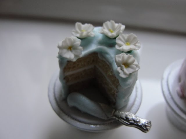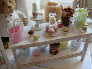 Thank you so much Liberty and Mercedes. Mercedes has made me many tiny polka dot pitchers. I love each and every one. And also some wonderful little cake stands. Of course I promptly added a cake to one for the picture. Wonderful.